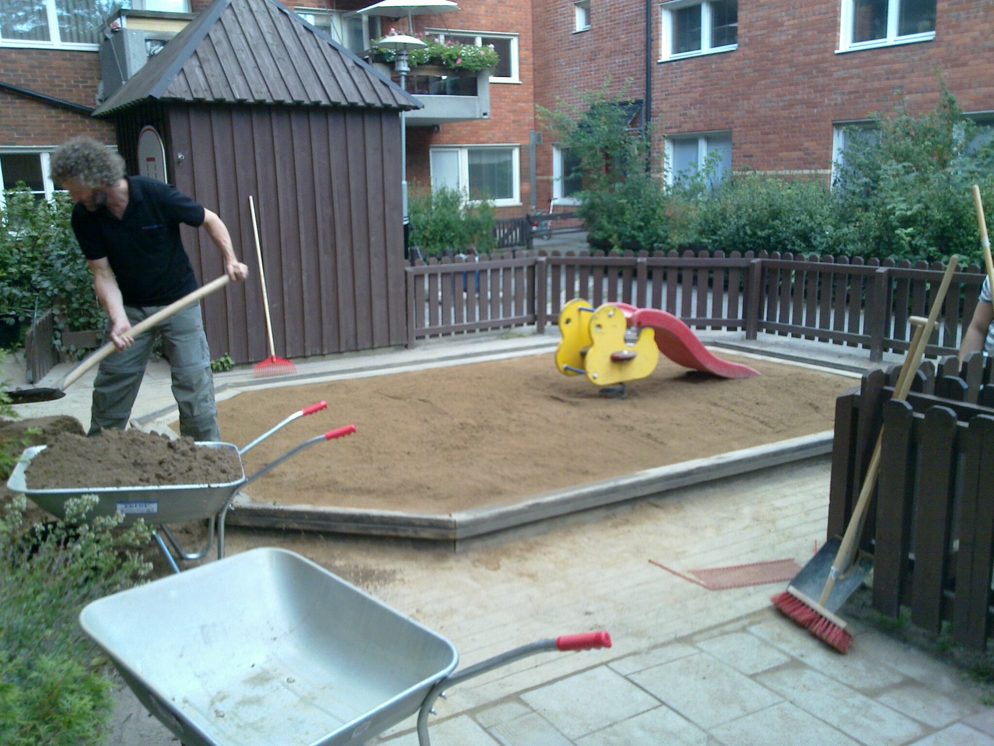 Daghemmet Papegojan fick ett länge efterlängtat sandbyte i lördags, 11. september! Samtidigt byttes också innehållet i vår andra sandlåda bredvid tvättstugan. Ett rent nöje för gårdens minstingar!