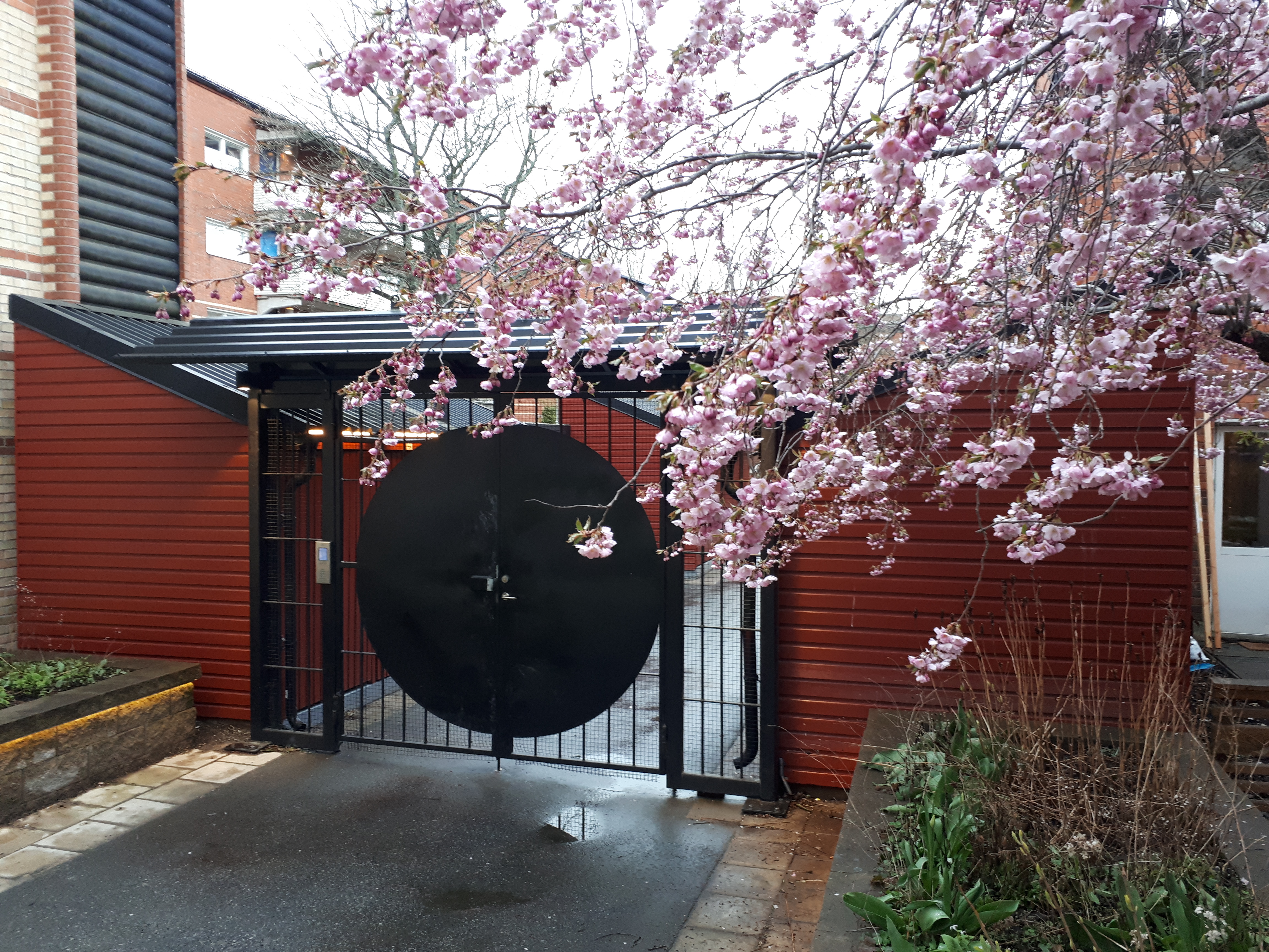 Gården är grön och lummig. Trots den begränsade ytan växer det flera plommon- och körsbärsträd på gården. Det finns två barnlekplatser för barn i åldrarna 2 – 10 år.
