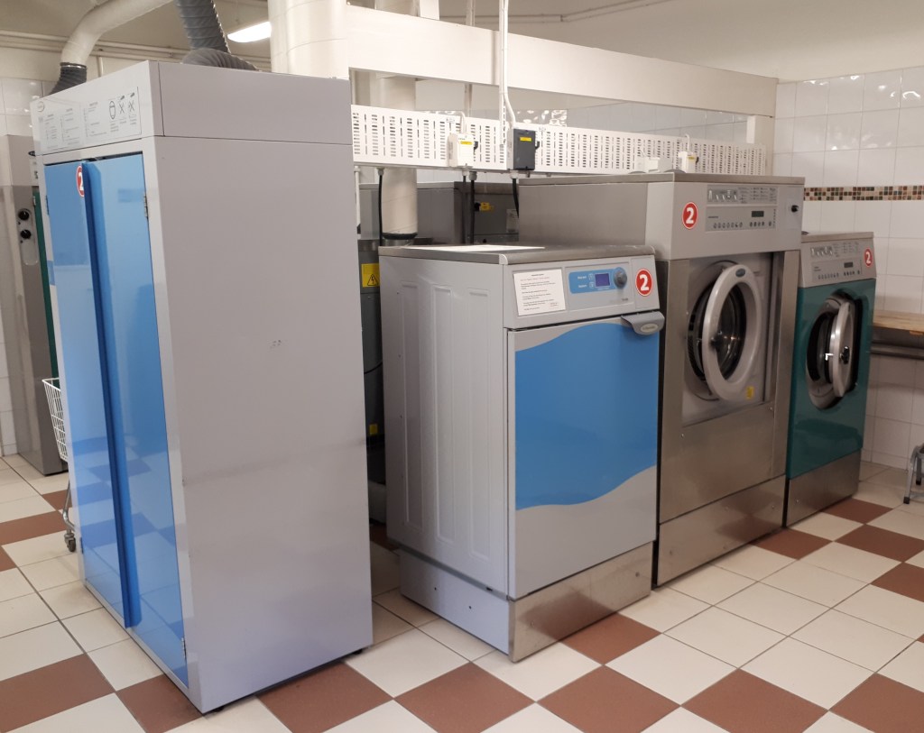 Bokningen av tvättid och tvättgrupp sker digitalt, antingen via en bokningsterminal till höger om den inre tvättstugedörren eller via en Aptus-app som man kan tanka in i sin mobiltelefon. För mer info om hur du gör – läs instruktionen som du når via följande länk: